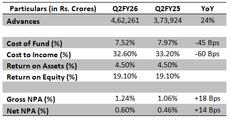 • Advances grew by 24% YoY to Rs.4,62,261 crore from Rs.3,73,924 crore.