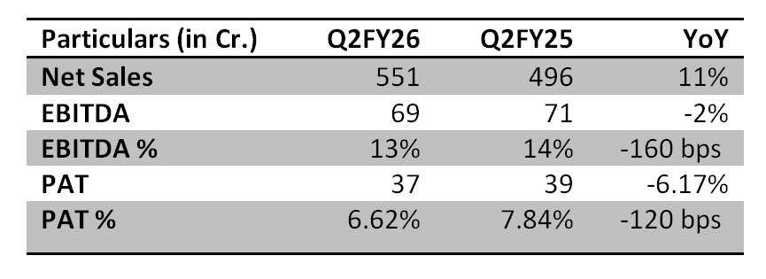 • EBITDA declined 1.7% YoY, with margins contracting to 12.6% from 14.2% last year. PAT stood at Rs. 36.5 crore, down 6% YoY, impacted by lower operating margins and higher depreciation.