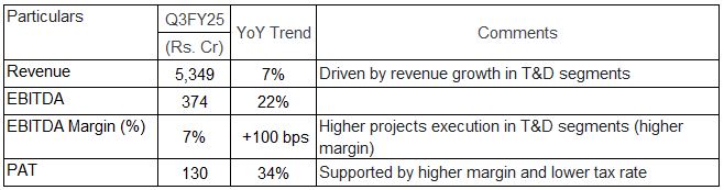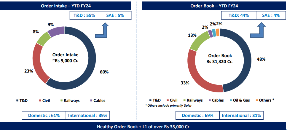 Power Transmission & Distribution: The company is a global leader in the Power Transmission & Distribution EPC space. This is the largest business vertical of the company. The company has capabilities to design, manufacture, test, supply and erect transmission lines on turnkey basis, along with end-to-end solutions for underground HT and EHV cabling works. The company also executes turnkey EPC projects that involve High Voltage Electrical Switching and Distribution Substations across the globe.