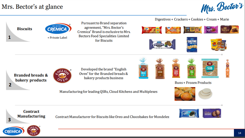 The company is one of the leading companies in the premium and mid-premium biscuits segment and the premium bakery segment in North India. It manufactures and markets a range of its biscuits such as cookies, creams, crackers, digestives and glucose under its flagship brand ‘Mrs. Bector’s Cremica’. It also manufacture and market bakery products in savoury and sweet categories which include breads, buns, pizza bases and cakes under its brand ‘English Oven’. It supplies its products to retail consumers in several states within India, as well as to reputed institutional customers with pan-India presence. ‘Mrs. Bector’s Cremica’ is one of the leading biscuit brands in the premium and mid-premium segment in Punjab, Himachal Pradesh, Jammu and Kashmir and Ladakh and ‘English Oven’ is the one of the largest selling brand in the premium bakery segment in Delhi NCR, Mumbai and Bengaluru. It is the largest supplier of buns in India to reputed QSR chains such as Burger King India, Connaught Plaza Restaurants, Hardcastle Restaurants, and Yum! Restaurants (India).