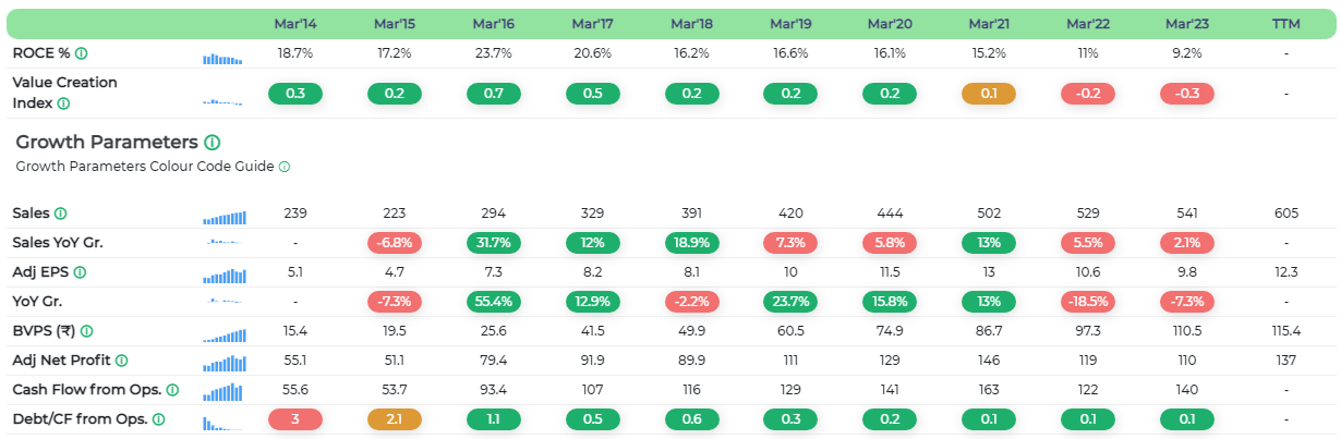 Financial track record gives insight into the company's performance on key parameters over the past ten years. MoneyWorks4me’s proprietary colour codes make it easy for retail investors to gauge the company’s past performance.