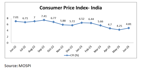 In June, India’s retail inflation rose to 4.81% from a 25-month low of 4.25% in May, as per data released by the Ministry of Statistics. The CPI inflation has consistently stayed within the RBI’s tolerance band of 2-6% for four consecutive months.