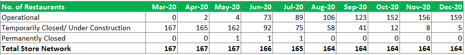 As of date, their restaurants in 77 cities across India have reopened, often with limited operations. The majority of their restaurants have opened for dine-in guests; however, the capacity may be limited, based on local regulations. In addition, the COVID- 19 pandemics have directly impacted their same-store sales in the restaurants.