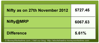 Considering the free float market capitalization at the MRP of individual stocks and considering the share price data as of 27th November, the Nifty@MRP comes out to 6067.63. On 27th November, NSE Nifty index closed at 5727.45, which is 5.61% or 340 points below the Nifty@MRP of 6067.63.