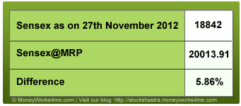 With similar calculation, the Sensex@MRP comes out to 20013. On 27th November, the Sensex closed at 18842, which is 5.86% or 1171 points below the Sensex@MRP of 20013.