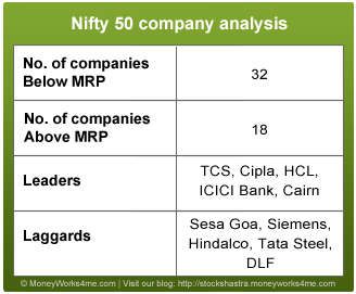Over all, out of 50 Nifty companies, around 32 companies are trading below their MRP (Under-valued) while only 18 companies are trading above their MRP (Over-valued).