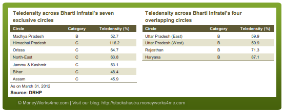 Bharti Infratel is primarily present in areas where the penetration or teledensity is low. Bharti Infratel is exclusively present in 7 circles (i.e. without Indus Towers’ presence) and 6 out of these 7 circles belong to Category C and 1 circle belongs to category B. The 4 circles where both Bharti Infratel and Indus Towers co-exist belong to Category B. The category B and C circles have a much lower teledensity than that of Category A and the metros. These categories are decided on the basis of the revenue generation potential of the circles.