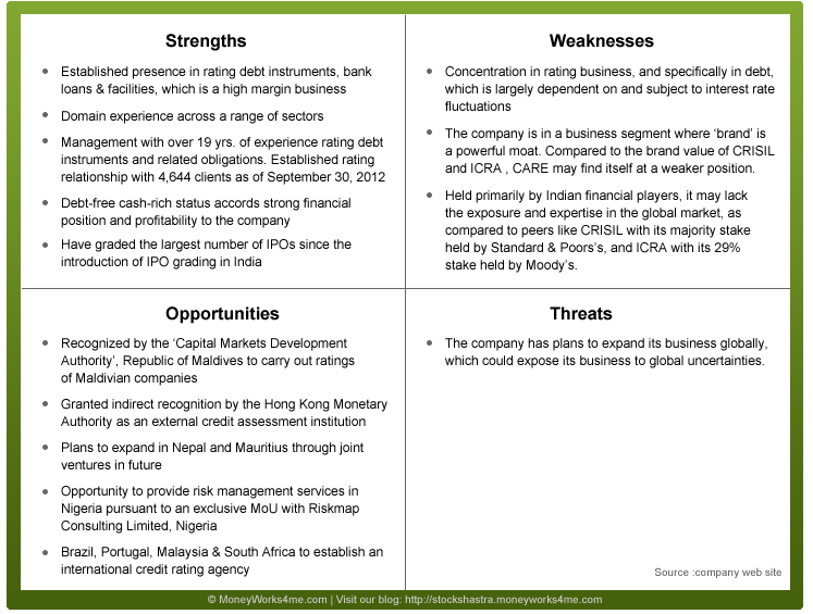 The company may face difficulty in gaining market share from existing listed peers such as CRISIL & ICRA. The company is trying to emulate its listed peers by expanding and diversifying its business into research wings. However, such initiatives take time to materialize.