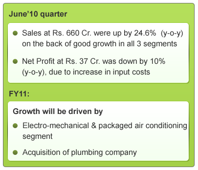 Recently, Blue Star acquired D S Gupta Constructions Pvt. Ltd for Rs. 80 Cr. which is amongst the largest independent plumbing and fire fighting contracting companies in India. This acquisition was done with the aim of providing plumbing services for commercial buildings. The funding for this will be done through internal accruals. The company, renamed as Blue Star Electro Mechanical, clocked a turnover of Rs. 130 Cr (FY10) and has an order book of Rs. 300 Cr for FY11. This acquisition is in line with the company’s aim to enhance its services in the MEP (mechanical, electrical and plumbing) segments and the robust order book gives good revenue visibility for FY11.