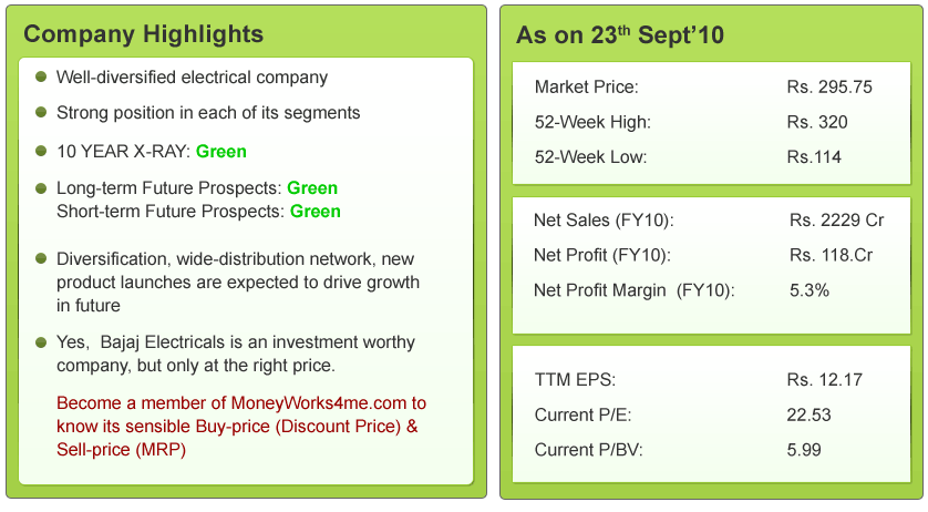 Bajaj Electricals is supported by a chain of about 600 distributors, 3000 authorized dealers and over 3,00,000 retail outlets. It mainly operates in the domestic market.
