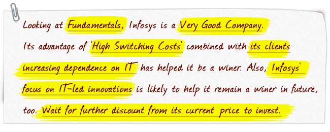 Despite these concerns, Infosys is well-positioned in an IT outsourcing market which is poised to grow at 15%+ CAGR for the next 10-12 years. In today’s changing world, opportunities have become inseparably linked with advances in IT & Infosys’s focus on building its IT capabilities. Also, the increasing demand from user-industries like BFSI, Manufacturing, Retail will enhance its revenue growth. Hence, we can expect the long-term future of Infosys to be Green (Very Good)