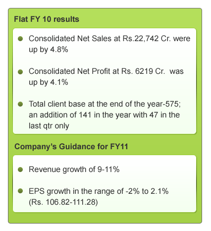 The company’s revenue guidance is good, with services like packaged implementation & consulting and verticals like Manufacturing, BFSI & Retail expected to drive growth. But the EPS guidance seems subdued; the company is expected to witness margin pressure (with the wage hikes and the appreciation in the Indian Rupee) and a higher tax rate in 2010-11. Also, with the European crisis becoming bigger with time, Infosys is likely to witness some risk, here. Hence, we can expect the short-term outlook of Infosys to be Orange (‘Somewhat Good’)
