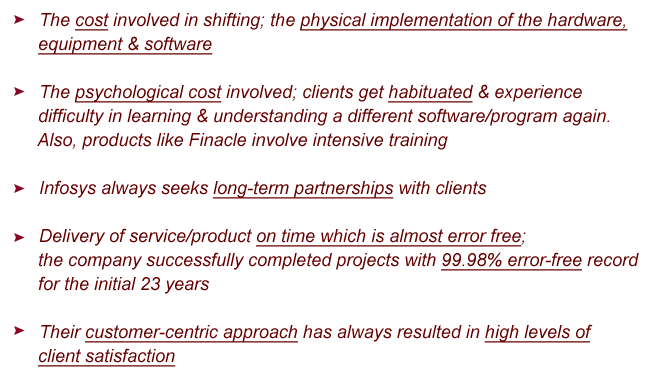 When clients go to Infosys for the first time they know they are partnering with one of the most competent software companies. But what is it that keeps them from switching to other IT partners; several reasons for this are: