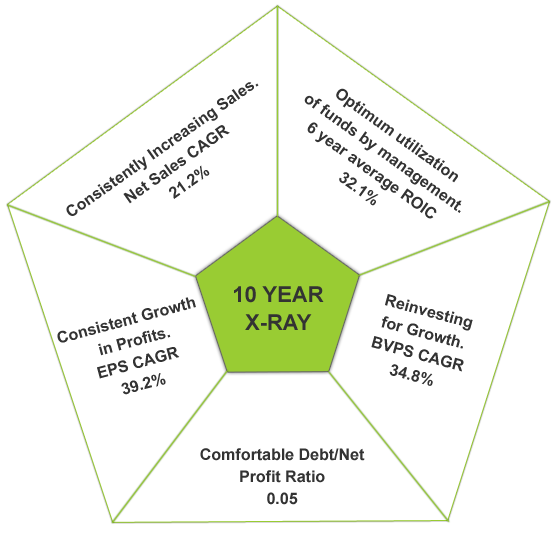 The company has clocked a good CAGR of 21.2% in Net Sales over the last 6 years mainly due to 19% volume growth; it has shown consistent demand for its products and services. A strong re-investment has helped the company clock a 6 year EPS CAGR of 39.2%. Its BVPS has registered a robust CAGR of 34.8% over the same period.