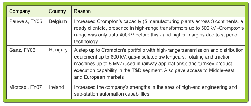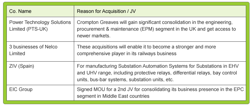 These acquisitions have catapulted Crompton Greaves into the global league. The company also has access to an expanded product range, with expertise in power services and the ability to provide total solutions. This along with the JVs mentioned in the short-term have been done with a similar aim to become a full solutions provider in the global market.