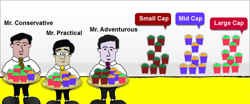 Mr. Adventurous, on the other hand, is willing to risk losing a large part of his investment, for the possibility of getting very high returns on his investments. So, he invests most of his funds in risky mid-cap and highly risky small-cap stocks; he keeps a very small part of his fund invested in large cap stocks.