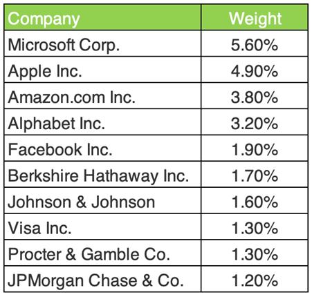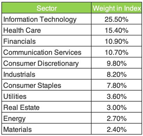 As the name implies, S&P 500 has 500 stocks and it is quite diversified with 25% in Information Technology, 15% in Health Care and ~10% each in Financials, Communication Services & Consumer Discretionary.