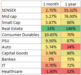 Performance of Real Estate, Consumer durables, and PSU stocks was very good in the previous month.