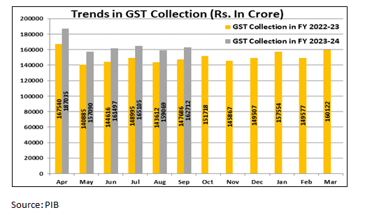 In September, the combined collection of GST by both central and state governments reached ₹1.62 trillion. This is the fourth-highest monthly collection since the introduction of the GST system and shows a 10% increase compared to the same period last year. The GST receipts for this year align with the finance ministry’s expected 10.5% nominal GDP growth rate. This shows the efficiency of the tax administration and increased consumption.