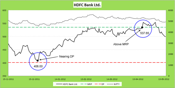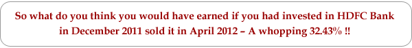 HDFC Bank is one of India's leading private sector banks. It has been one of the most reliable and consistent performer’s in the banking space. Due to the general pessimism prevailing in the markets in the month of Nov-Dec, the Nifty index was in a free-fall. In keeping with the general market trend, the stock price touched Rs. 406 (close to the MoneyWorks4me Discount Price) in December, 2011 creating a good buy opportunity for investors.