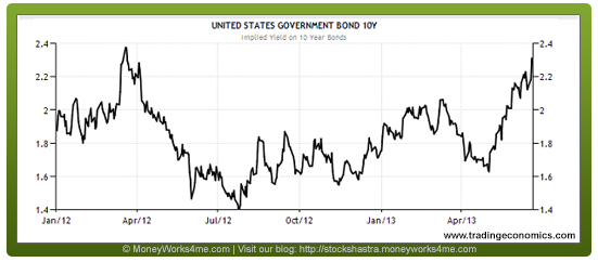 US Fed’s original target, while unleashing QE3, was to get the US unemployment rate down to 6.5% provided inflation expectations remain anchored below 2% rate. Now, provided Fed’s expectations are met by April 2014, it has signaled towards tapering of the bond purchases later this year.