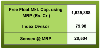 The free float market capitalization at the MRP of the individual stocks as computed by us at MoneyWorks4me.com and using share data as on 16th February 2011 is Rs. 1,639,868 Cr. Using the index divisor 79.98 (as on 16th February 2011) the Sensex@MRP comes out to 20,504.