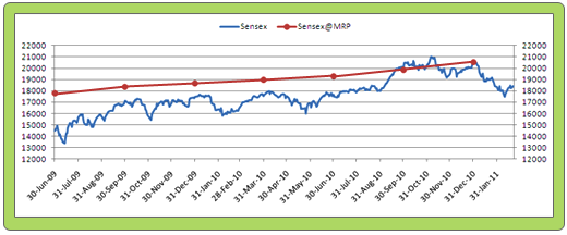 So, currently, the Sensex, which is close to 18,300 (as of 21st February), is 11% or 2200 points below the Sensex@MRP.