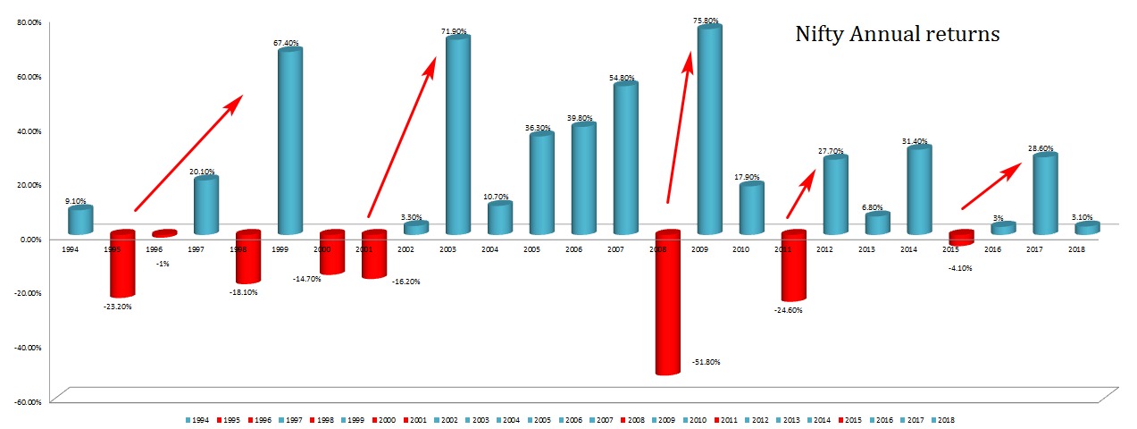 Equity returns aren’t linear meaning, Equities do not generate return every year like Fixed Deposits. Look at the graph below.
