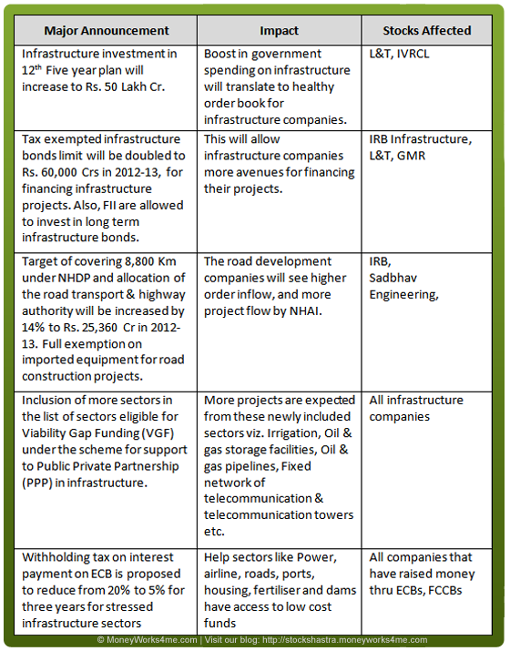 Budget 2012-13 has good emphasis on infrastructure development. Many initiatives have been taken to boost infrastructural activities in the country. Various measures taken are aimed at benefiting the infrastructure industry as a whole. Out of doubled limit of Rs. 60,000 Crs., Rs. 10,000 Cr. each has been allocated to NHAI, IRFC, IIFCL and power sector. Thus the spending by each of these agencies will flow to infrastructure space, either directly or indirectly. Besides as infrastructure shows growth, the allied industry like Cement, Steel and capital goods are also expected to show higher growth.