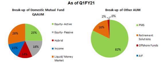 In terms of mutual fund business, the company manages 153 mutual fund schemes comprising equity, hybrid, income, liquid, and money market funds with a Quarterly Average AUM (QAAUM) of ~Rs. 1.3 lakh Cr as of June 2020.