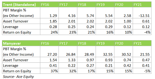 Based on our valuation of businesses growing at a higher rate of 25% and earning above-average ROE of 25%, we believe ~30x is the fair multiple. Looking at the current valuation, we think it is stretched and is factoring in very high growth. The valuation of the company is close to its listed peer Trent Ltd.