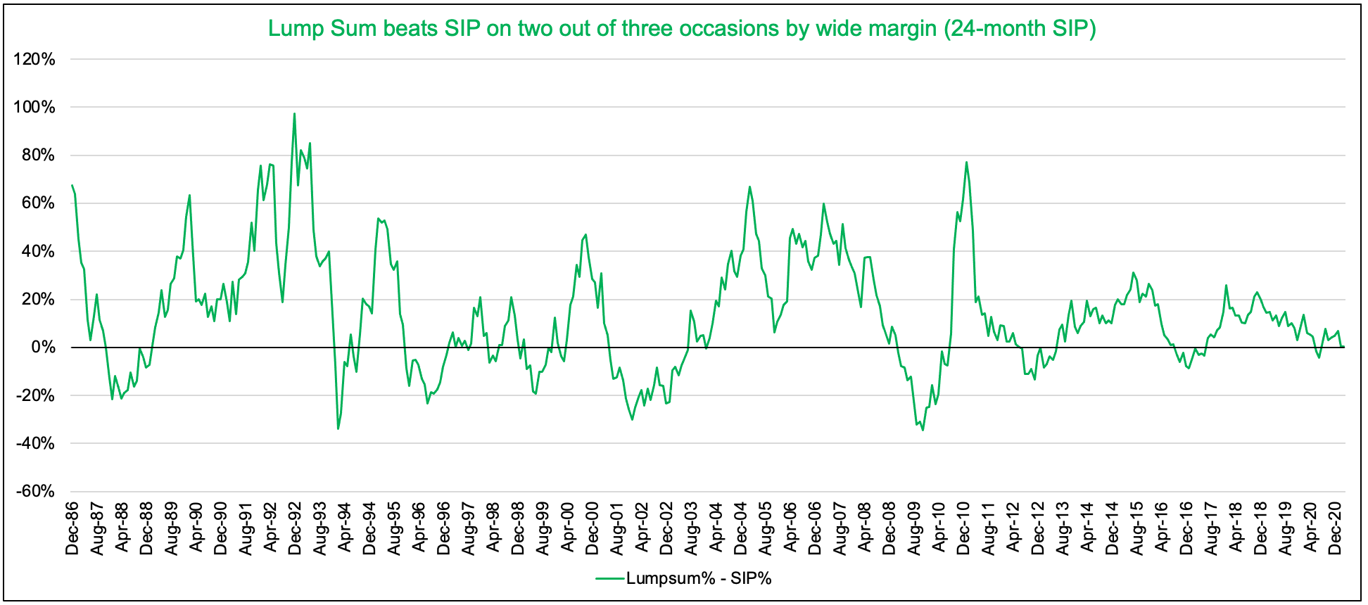 We compute Lumpsum returns if it were invested at the start of the 24-month period and compare it with SIP return over those 24-months. We have taken the time period from Jan-85 to Mar-21.
