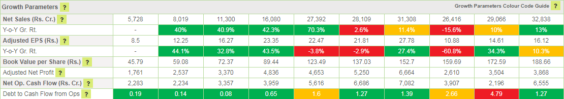 - Quality of Portfolio Holding: Moneyworks4Me has color-coded stocks as Green, Orange and Red based on whether the company's performance has generated a ROCE above a threshold level (cost of capital) over 10 years (minimum 6 years) and generated positive Free Cash Flow. For Banks it checks whether ROE is greater than 15% and sales has grown over previous year. Stocks that perform consistently on these combined metrics are color-coded Green (min score 14 out of 20), Orange (between 8 and 14) and Red (less than 8 out of 20). Fund are color-coded Green provided the portfolio has 70% holding in Green stocks but not more than 20% in Red stocks. Funds with more than 20% Red stocks in the portfolio are color-coded Red. The rest are Orange funds